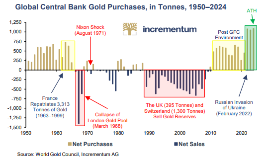 (While this Incrementum AG chart is from 2024, it exemplifies that during the 2000s precious metal bull run, global central banks were net sellers of gold)